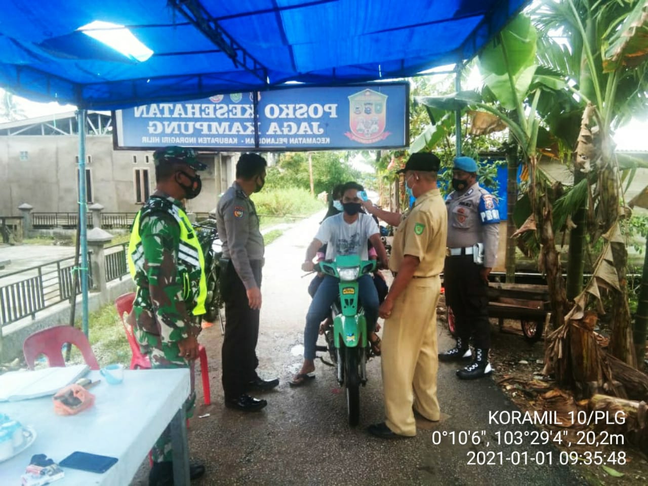 SERIBUPARITNEWS.COM, PELANGIRAN - Serma Sri wahyono Babinsa 10/Pelangiran Kodim 0314/Inhil Bersama Unsur Satgas Penanganan Covid 19 Kecamatan Pelangiran Semangat Melaksanakan Portokes di Kecamatan Pelangiran Kabupaten Indragiri Hilir Jumat (01/01/2021)