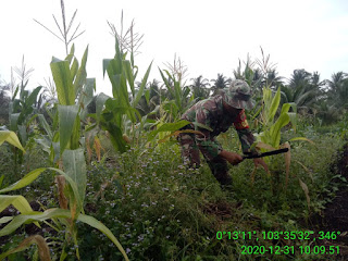 Koptu Candra Bastian Babinsa desa Rotan Semelur Koramil 10/Pelangiran Kodim 0314/Inhil Setiap hari membersihkan Demplot Pertanian Jagung di Desa Binaan