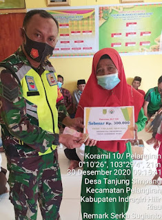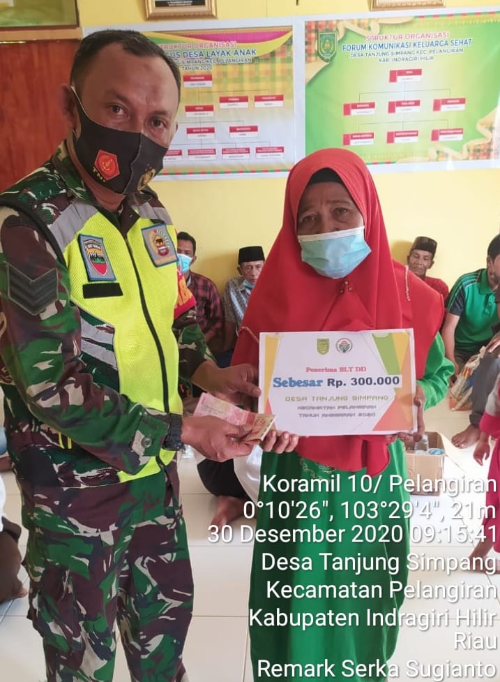 SERIBUPARITNEWS.COM, PELANGIRAN - Serka Sugiantoro Babinsa Tanjung simpang Koramil 10/Pelangiran Kodim 0314/Inhil melaksanakan Kegiatan Penyaluran Bantuan BLT DD di desa Tanjung Simpang Kecamatan Pelangiran Kabupaten Indragiri Hilir Rabu (30/12/2020)
