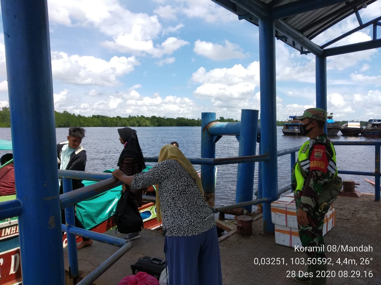 SERIBUPARITNEWS.COM, MANDAH -; Babinsa Serda Erik A. Sibarani Babinsa Koramil melaksanakan Gakplin Prokes Covid -19 kepada para penumpang bod yang turun naik di Pelabuhan Sembuang Kelurahan Khairiah Mandah Kecamatan Mandah Kabupaten Indragiri Hilir Senin (28/12/2020)
