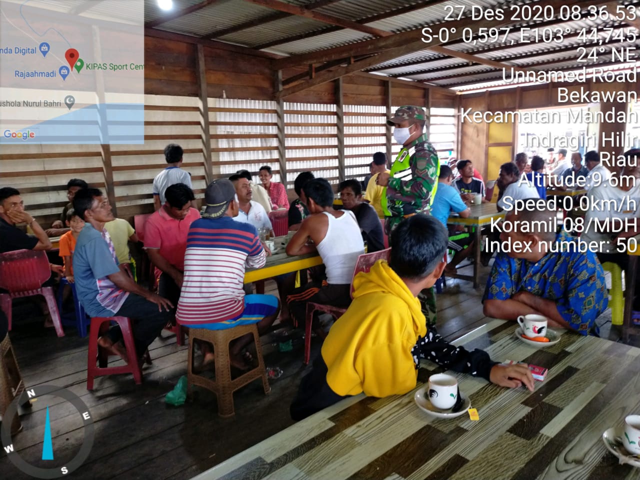SERIBUPARITNEWS.COM, Babinsa Koramil 08/Mdh.Serda Haris Moni Melaksanakan sosialisasi Prokes Covid -19 bersama masyarakat di warung kopi pasar Bekawan Desa Bekawan Kec. Mandah Kab. Inhil Minggu (27/12/2020)
