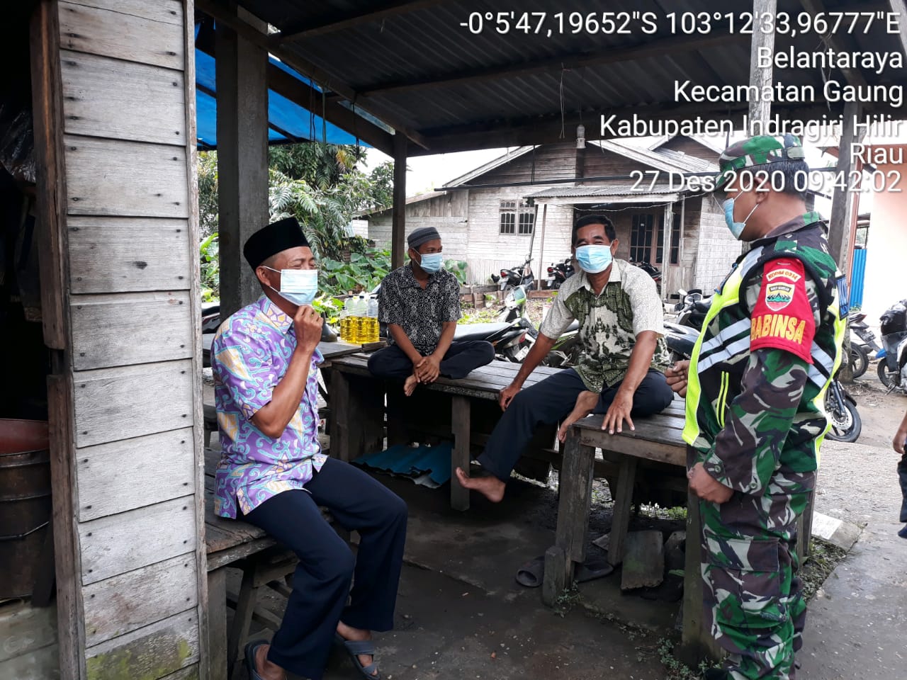 SERIBUPARITNEWS.COM, GAUNG - Serka Sasmito Babinsa Belantaraya Koramil 05/Gaung Anak Serka Kodim 0314/Inhil kembali melaksanakan penegakkan disiplin protokol kesehatan di Desa Belantaraya Kecamatan Gaung Kabupaten Indragiri Hilir Minggu (27/12/2020)