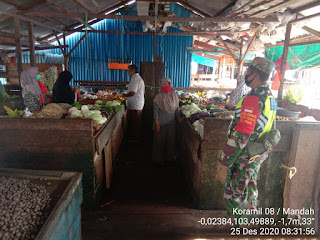SERIBUPARITNEWS.COM, MANDAH - Babinsa Koramil 08/Mandah Kodim 0314/Inhil Serda Erik A. Sibarani Melaksanan  Prokes Covid -19 kepada masyarakat yang berkumpul di Pasar Sendawa Desa Bakau Aceh Kecamatan Mandah Kab. Inhil Jumat (25/12/2020)