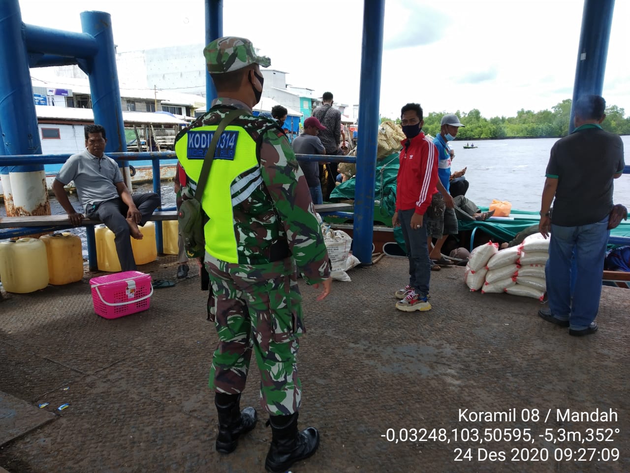 SERIBUPARITNEWS.COM - Babinsa Koramil 08/Mandah Kodim 0314/Inhil Serda Erik A. Sibarani Melaksanan Prokes Covid -19 kepada penumpang bod dan warga yang berkunjung di Pelabuha Sembuang Kelurahan Khairiah Mandah Kecamatan Mandah Kab. Inhil Kamis (24/12/2020)