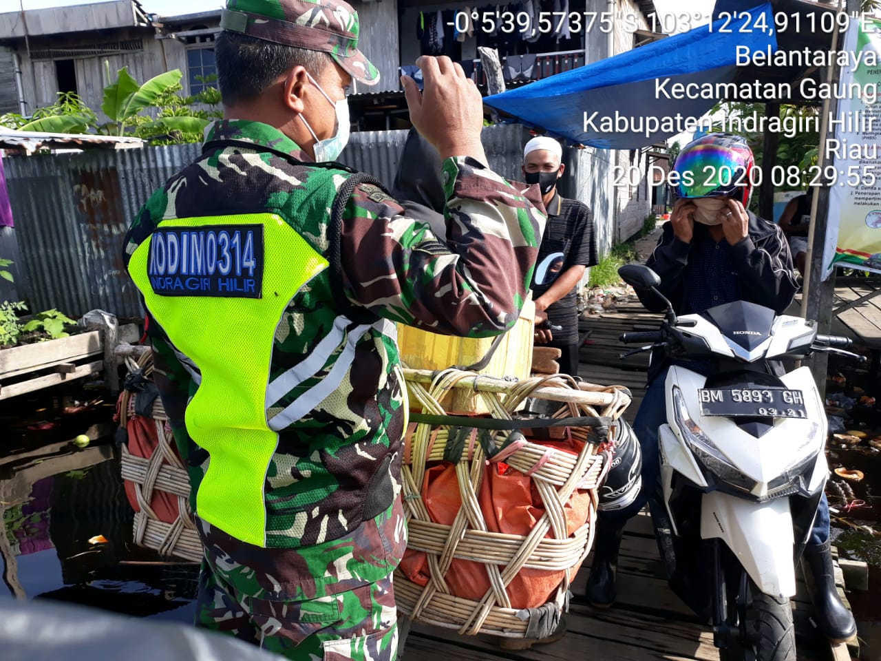 SERIBUPARITNEWS.COM, GAUNG   - Bersinergi  itu yang di lakukan Babinsa Koramil 05/Gaung Anak Serka  Kodim 0314/Inhil  Serka Sasmito  dengan Tim Gugus Tugas  dalam penegakkan disiplin protokol kesehatan di Desa Belantaraya Kecamatan Gaung Kabupaten Indragiri Hilir Minggu (20/12/2020)