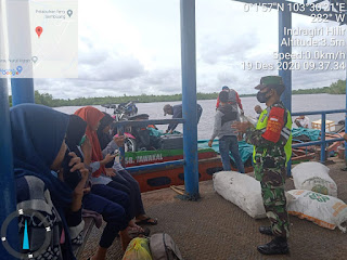 SERIBUPARITNEWS.COM,MANDAH - Babinsa Igal Koramil 08/Mandah Kodim 0314/Inhil Serka H.Situmorang Melaksanan Gakplin Prokes Covid -19 dengan penumpang bod dan warga pengunjung di Pelabuhan Bod Sembuang Kelurahan Khairiah Mandah Kecamatan Mandah Kab. Inhil Sabtu (19/12/2020)