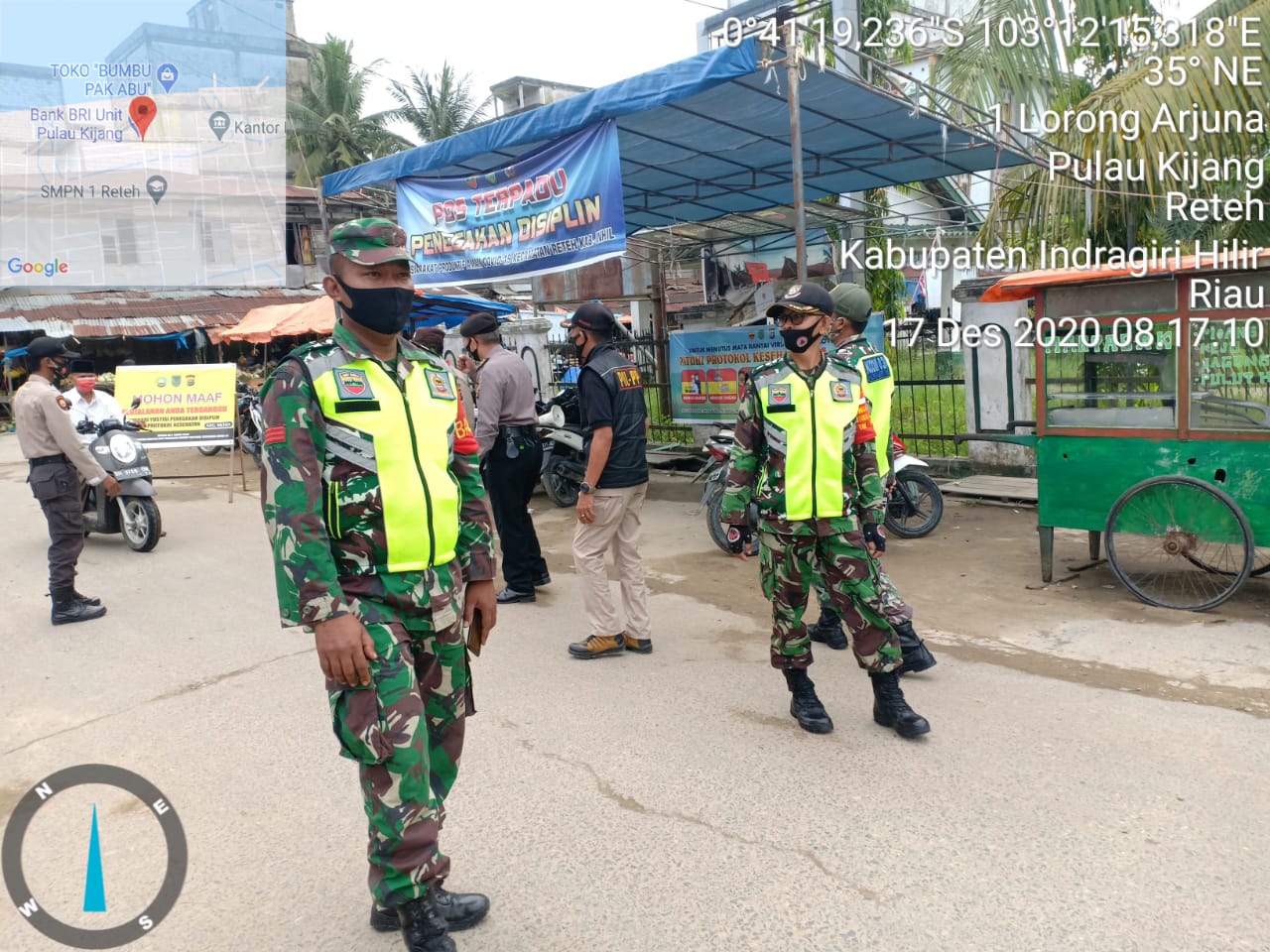 SERIBUPARITNEWS.COM,PULAU KIJANG RETEH,"-Babinsa Koramil 07/Reteh Kodim 0314/Inhil bersama  Anggota Polsek Reteh dan Satpol PP Kecamatan Reteh Team Kesehatan, melaksanakan penegakan disiplin protokol kesehatan,memberikan himbauan untuk mematuhi protokol kesehatan dalam pencegahan penyebaran Corona Virus Desease 2019 (Covid 19 ) di Pasar Pulau Kijang Kec Reteh Kab Inhil.Kamis  (17/12/20).