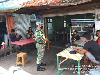SERIBUPARITNEWS.COM, MANDAH -  Babinsa Koramil 08/Mandah Kodim 0314/Inhil Serda Erik A Sibarani Melaksanakan sosialisasi Gakplin Prokes Covid kepada pemilik warung dan warga pengunjung di Warung kopi dan pasar Sendawa Desa Bakau Aceh Kecamatan  Mandah Kabupaten Inhil Minggu (06/12/2020)