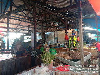 Karena pasar merupakan pusat keramaian Serda Erik mengatur jumlah kerumunan yang diperbolehkan dan memberikan batas antara satu pedagang dengan pedagang yang lainnya
