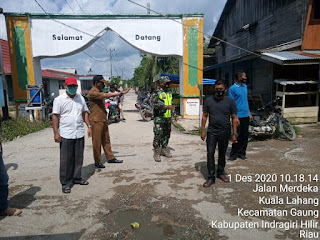 SERIBUPARITNEWS.COM, GAUNG - Serka Tota Simbolon Babinsa Kuala Lahang Koramil 05/Gas Kodim 0314/Inhil  Penegakan Disiplin Protokol Kesehatan New Normal Penanganan Covid 19 Terpadu* diwilayah kelurahan Kuala Lahang Kecamatan Gaung Kab. Inhil Selasa (01/12/2020)