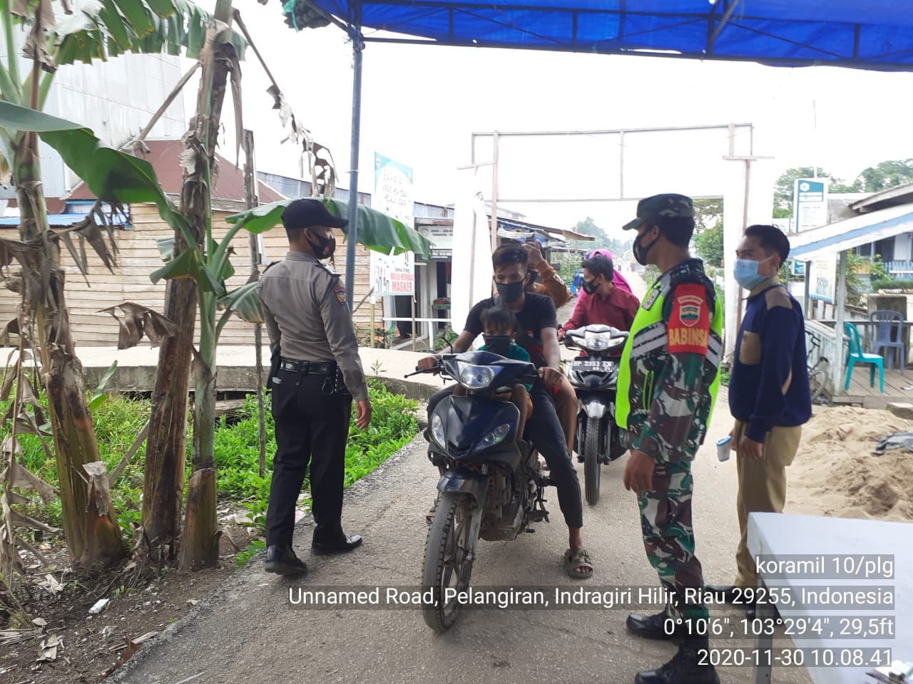 SERIBUPARITNEWS.COM, PELANGIRAN - Dalam penegakkan. disiplin Protokes yang dilakukan Babinsa Koramil 10/Pelangiran Kodim 0314/Inhil setiap hari tentunya tidak terlepas dari kerjasama tim gugus Senin (30/11/2020)