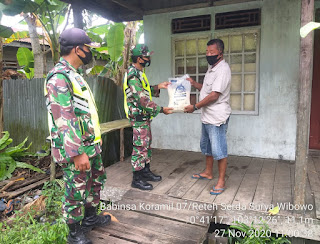 Giat memberikan bantuan sembako kepada warga kurang mampu itu dilaksanakan oleh Batuud koramil 07/Reteh Serda Surya Wibowo Beserta Serda Ramli Serda Pardamean Siregar dan Praka Sudarwis memberikan bantuan sembako kepada warga, Jumat (27/11/2020).