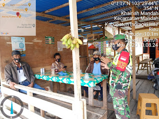 SERIBUPARITNEWS.COM, MANDAH - Babinsa Igal Koramil 08/Mandah Kodim 0314/Inhil Serka H.Situmorang Melaksanakan Penegakan Disiplin Protokol Kesehatan Covid -19 kepada warga yang berada di warung kopi Kelurahan Khairiah Mandah Kec. Mandah Kab. Inhil.Kamis (26/11/2020)