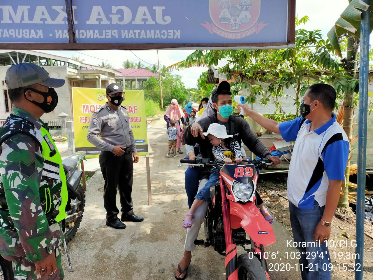 Pengecekan orang yang keluar masuk tidak menggunakan masker dan Pengecekan Suhu Badan bagi orang yg keluar masuk desa pelangiran Guna Percepatan Memutus Rantai Penanggulangan Penyebaran Covid-19