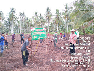 Babinsa Bente Koramil 08/Mandah Kodim 0314/Inhil Bersama warga dan Pemuda binaan melaksanakan Gotong Royong Pembersihan Lahan Demplot Ketahanan Pangan