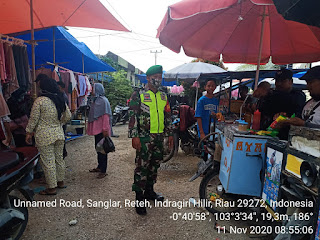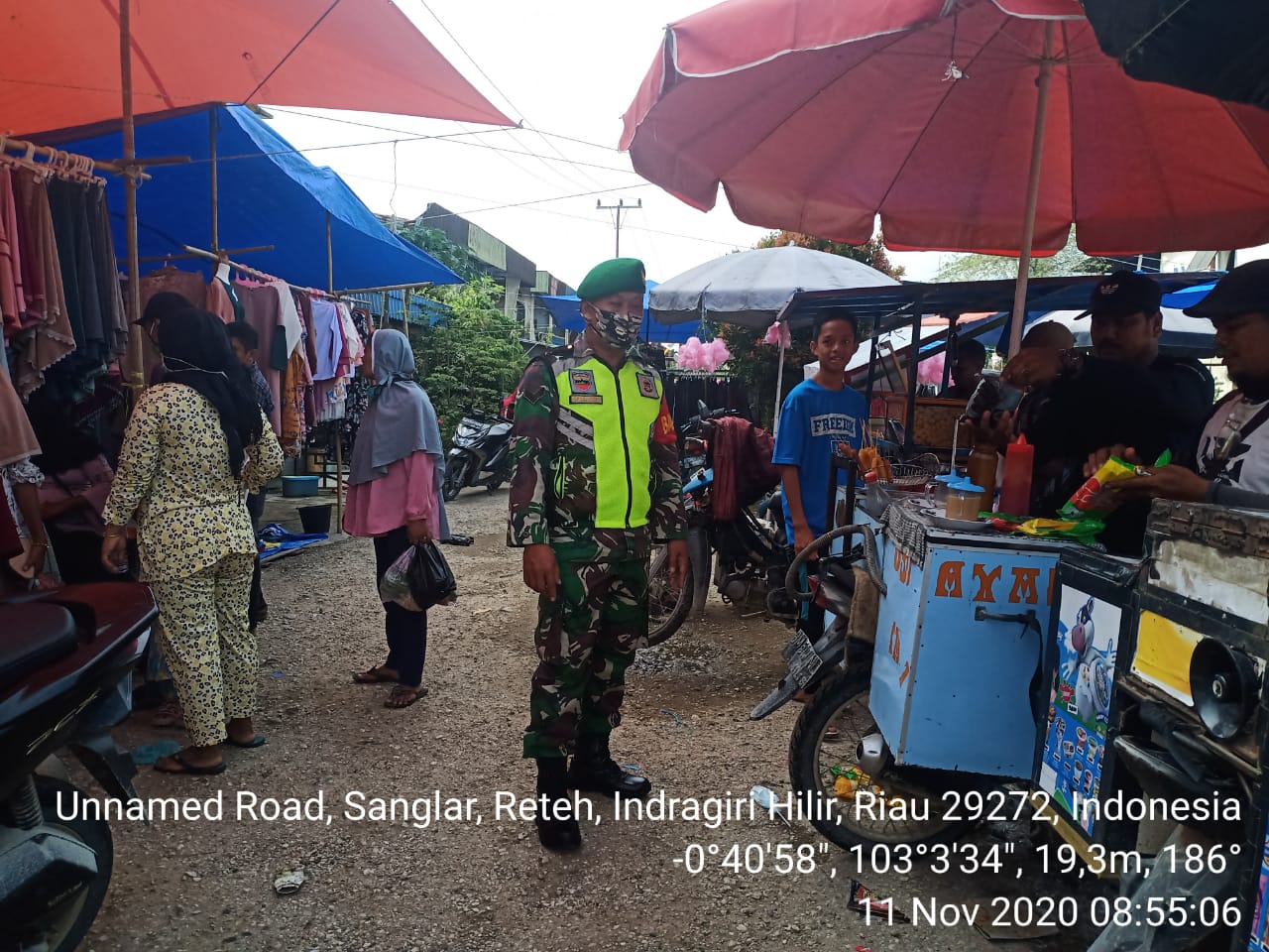 SERIBUPARITNEWS.COM ,Sanglar– Membantu Pemerintah dalam pemutusan mata rantai penyebaran virus Covid-19, Anggota Koramil 07/Reteh Kodim 0314/Inhil melakukan pantauan Penegakan Disiplin Mematuhi Protokol Kesehatan (PDMPK) di pasar tradisional di Desa Sanglar wilayah Koramil 07/Reteh, Rabu (11/11/2020).