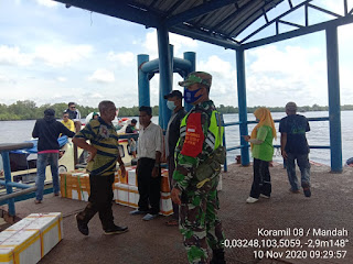 SERIBUPARITNEWS.COM,MANDAH - Babinsa Koramil 08/Mdh Desa Bakau Aceh Serda Erik A. Sibarani Melaksanakan Sosialisasi Himbauan Gaklin Protokol Kesehatan Tentang Pencegahan Virus Covid -19 bersama Warga di Pelabuhan Sembuang tempat turun naik penumpang yang singgah di Mandah dan yang akan Ke Tembilahan Selasa (10/11/2020)