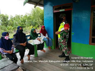SERIBUPARITNEWS.COM, MANDAH -  Babinsa Koramil 08/Mandah  Desa Belaras Serma Darmansyah Melaksanakan sosialisasi himbauan Pencegahan penyebaran Virus Covid -19 bersama Warga di Desa Belaras Kecamatan Mandah Selasa (10/11/2020)