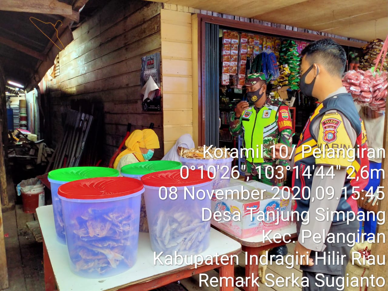SERIBUPARITNEWS.COM, PELANGIRAN - Babinsa Koramil 10/Pelangiran Kodim 0314/Inhil Serka Sugianto dan Babikatibmas melaksanakan Himbauan pemakaian masker di Pasar Pagi tanjung simpang Kecamatan Pelangiran Minggu (08/11/2020)