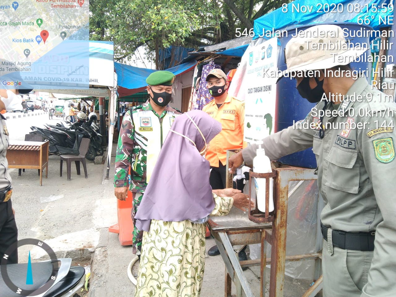 SERIBUPARITNEWS.COM, TEMBILAHAN - Babinsa Koramil 01/Tembilahan Kodim 0314/Inhil tetap melaksanakan penegakkan disiplin protokol kesehatan di Posko air mancur Jalan Jenderal Sudirman Kelurahan Tembilahan Kecamatan Tembilahan Minggu (08/11/2020)