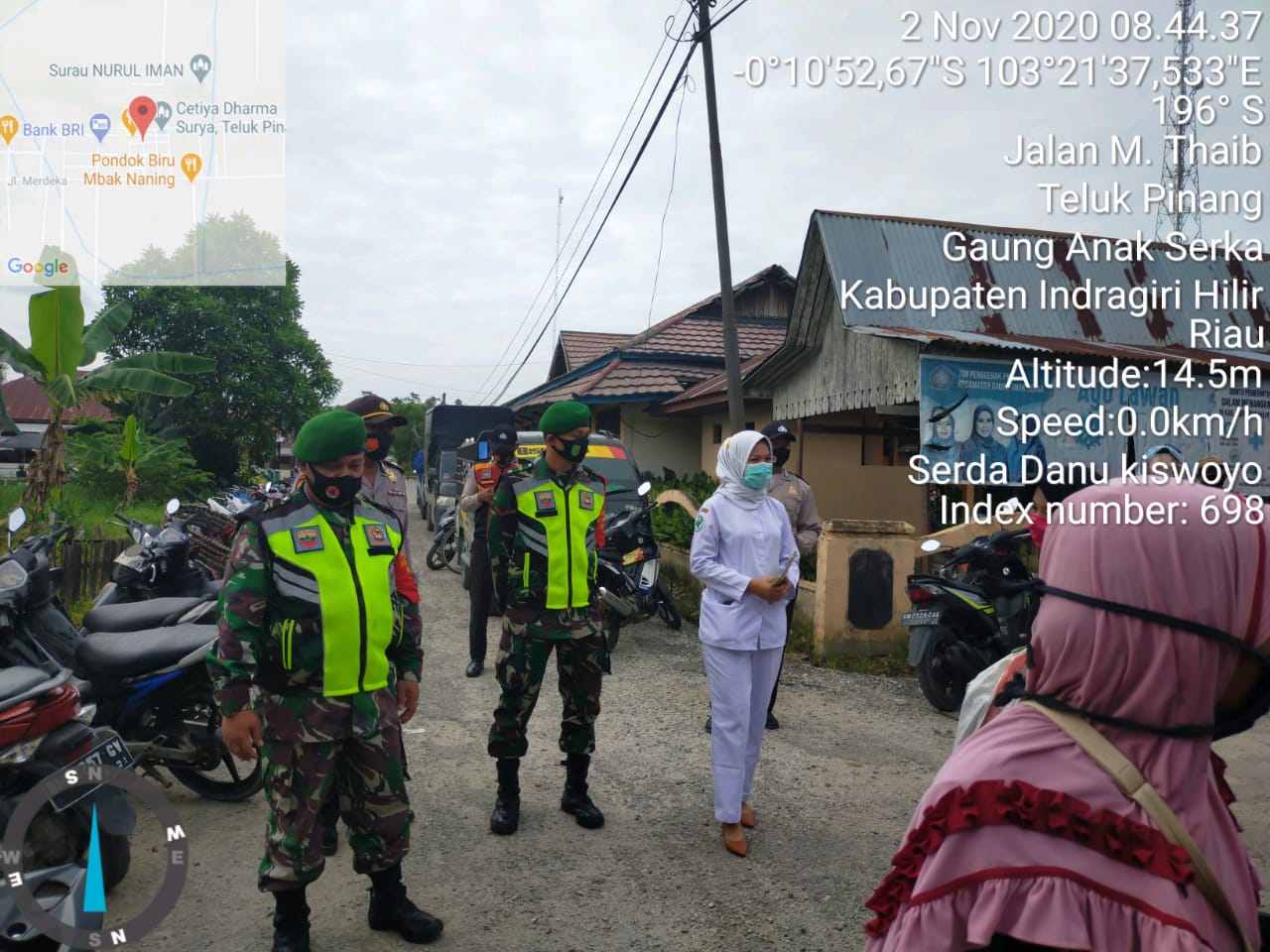 Babinsa Teluk Pinang Koramil 05/Gas bersama Tim Kesehatan lakukan pengecekan suhu