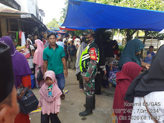 Babinsa Gembira Koramil 05/Gas Koramil 05/Gas Kodim 0314/Inhil Sertu Sugeng selalu mengingatkan kepada para pedagang dan pembeli di Pasar Pekan Jum'at Desa Gembira Kec. Gaung Kab. Inhil, Jum'at, 9/10/2020.