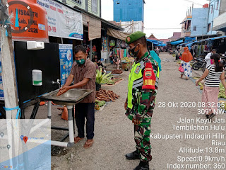 Dalam kegiatan penegakkan disiplin protokol kesehatan hari pelda Jaharzam bersama satgas Penanggulangan covid-19 bersama sama menyisir setiap sudut pasar kayu jati yang berada di kecamatan Tembilahan Hulu tanpa terkecuali untuk menghimbau akan protokol kesehatan Rabu (28/10/2020)