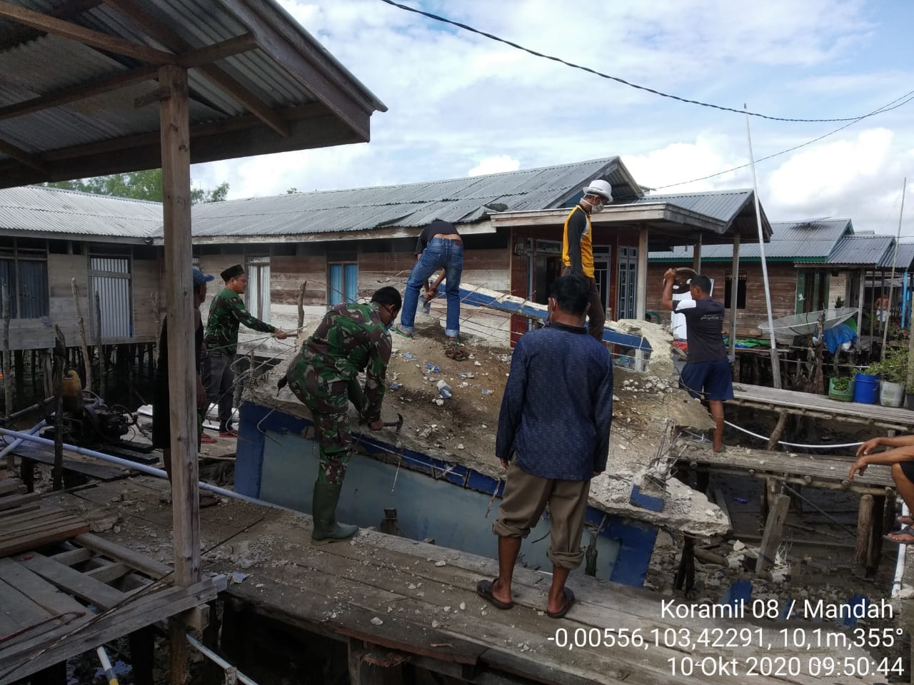 Bersama warga desa sendawa Serka erik membongkar bangunan fasilitas air bersih, yang nantinya akan dibangun kembali permanen