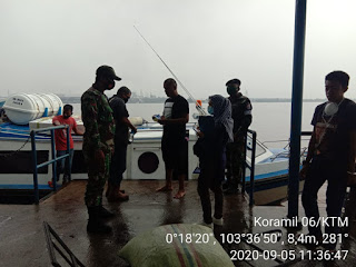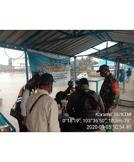 SERIBUPARITNEWS.COM, KATEMAN - Babinsa Koramil 06/Kateman Kopda Al Alim masih melaksanakan pengawasan bersama Tim Gugus guna penegakkan disiplin protokol kesehatan di Pelabuhan Syahbandar Sungai Guntung Sabtu (05/09/2020)