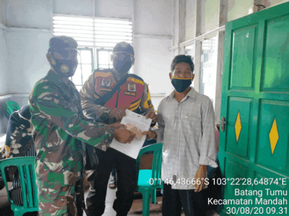 SERIBUPARITNEWS.COM,MANDAH - Babinsa Batang Tumu Koramil 08 Mandah Serda Tulus Lumban Gaol hari ini melaksanakan pengamanan dalam rangka penyaluran Bantuan Sosial Tunai (BST) Tahap 4 dan 5 dikantor desa batang Tumu Minggu (30/08/2020)