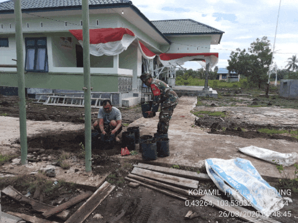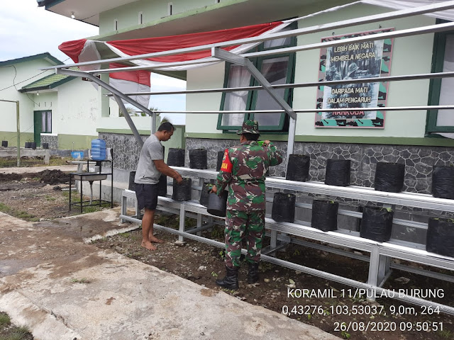 SERIBUPARITNEWS.COM,PULAU BURUNG - Pada hari Rabu tanggal 26 Agustus 2020 mulai pukul 08.00 wib  Anggota koramil 11/Pulau Burung Melaksanakan Penanaman terong dan cabe menggunakan steling polibet