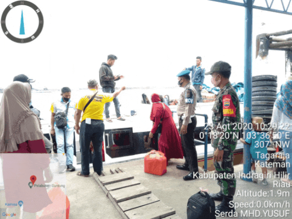 SERIBUPARITNEWS.COM, KATEMAN - Babinsa Taga Raja Koramil 06/Kateman Serda M.Yusuf tetap melaksanakan tugasnya dalam memutus mata rantai penyebaran Covid -19 di Pelabuhan Syahbandar Sungai Guntung Minggu (23/08/2020)