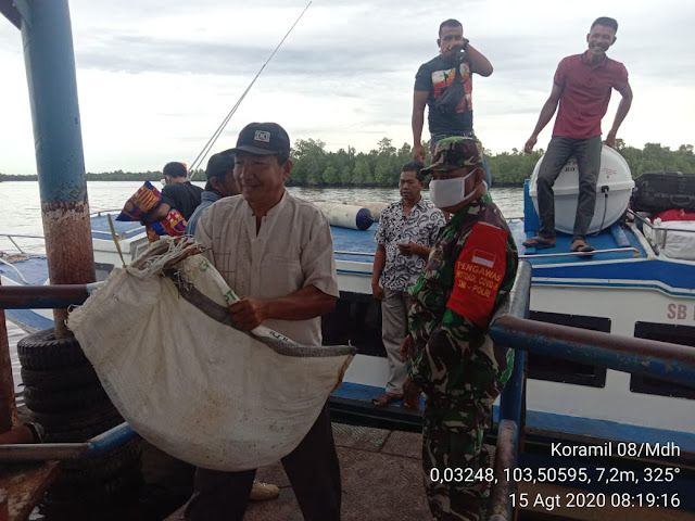 Babinsa bolak Raya Kopda Adlis didampingi Pjs.Danramil 08 Mandah Pelda Suriadi  melaksanakan himbauan mematuhi protokol kesehatan di Pelabuhan desa