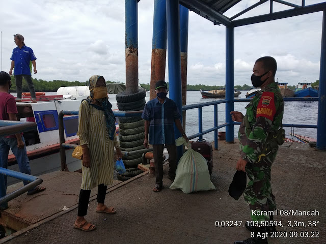 SERIBUPARITNEWS.COM,MANDAH - Babinsa Bakau Aceh Serda Erik Arianto Sibarani terus melaksanakan protokol kesehatan di Pelabuhan Sembuang Sabtu (08/08/2020)