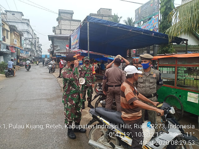 Pelaksanaan sosialisasi Protokol Kesehatan kepada warga sebagai salah satu upaya untuk memutus mata rantai penyebaran Corona Virus desease (Covid-19) secara rutin dan terus menerus dilaksanakan para Babinsa Koramil 07/Reteh Berserta Tem Satgas Covid 19 Kecamatan Reteh yang terdiri dari TNI-POLRI, SAT POL PP,TEM KESEHATAN DAN RELAWAN walaupun hujan tak jadi halangan bagi tem gugus tugas penanggulangan covid 19 di kec reteh.Selasa 03/08/2020