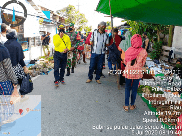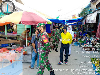 SERIBUPARITNEWS.COM, TEMBILAHANHULU - Babinsa Pulau Palas Koramil 01 Tembilahan Serda Ali Sabri bersama Personil Babinsa Korami 01 Tembilahan lainnya pada hari pasar di Hari Minggu menjalankan Sosialisasi protokol kesehatan pencegahan Covid -19 (05/07/2020)
