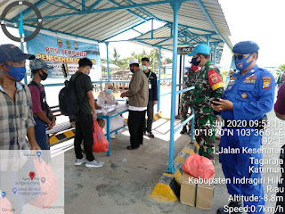 SERIBUPARITNEWS.COM,KATEMAN - Babinsa Koramil 06/Kateman Serda M.Yusuf bersama personil Babinsanya yang lain hari ini tetap menjalankan Gakplin Protokol Kesehatan di Pelabuhan Syahbandar Sungai Guntung Sabtu (04/07/2020)