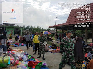 SERIBUPARITNEWS.COM,TEMBILAHANHULU - Personil Koramil 01 Tembilahan yang dipimpin Pelda Khaidir Bersama Tim Gugus Tugas Desa melaksanakan sosialisasi penegakkan disiplin protokol kesehatan di Pasar Desa Pekankamis Kamis (02/07/2020)