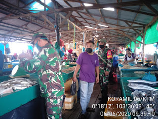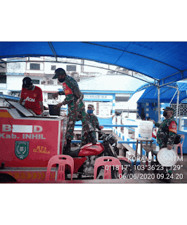 SERIBUPARITNEWS.COM, KATEMAN - Personil Koramil 06/Kateman yang dipimpin Batuud Pelda Samsuir melaksanakan Penegakkan Disiplin Terpadu Protokol Kesehatan Dalam Rangka Pencegahan COVID-19 berupa himbauan Pemakaian Masker,Jaga Jarak, mencuci tangan dan pengecekan suhu tubuh Sabtu (06/06/2020)