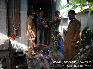 Babinsa Lahang Tengah Koramil 05/Gas Serda Jonlis Panggabean menghadiri pembagian Sembako kepada warga terdampak covid 19 di Desa Lahang Tengah Kec. Gaung , Senin,18/05/2020 padi..