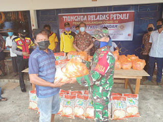 SERIBUPARITNEWS.COM, MANDAH - Babinsa Belaras Koramil 08 Mandah Serma Darmansyah dan Paguyuban Sosial Marga Tionghoa Indonesia (PSMTI) Desa Belaras Mengadakan Pembagian sembako kepada warga Senin (18/05/2020)