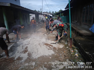 Serda Jonlis Panggabean Babinsa Lahang Hulu Koramil 05/Gas melaksanakan gotong royong semenisasi jalan parit mesjid di Desa Lahang Hulu Kec. Gaung, Jumat,08/05/2020 pagi tadi.