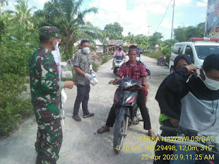 Komandan  Koramil 05/Gas Kapten Arh Panca Prasetiyo bagi bagi masker gratis kepada warga di desa Sungai Iliran Kec Gaung Anak Serka Rabu,22/04/2020 pagi tadi.
