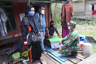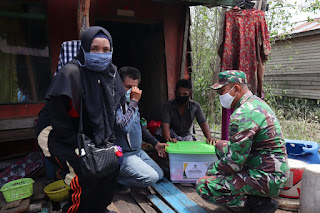 Lurah Tembilahan Barat Kadarinawati, S.Sos.,M.Si Bersama Tim Gugus Tugas Kabupaten (Kodim 0314 Inhil) yang diwakili Pasiop Kapten Inf.Tarmizi, BPBP Sahadi dan Dinsos Sulaiman memberikan bantuan paket sembako kepada Keluarga Almarhumah diduda PDP Positif Covid -19 tersebut