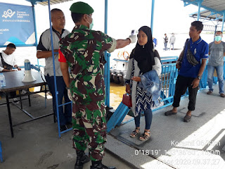 SERIBUPARITNEWS.COM, KATEMAN - wujud pencegahana tetap Covid -19 Koramil 06 Kateman tetap konsisten melaksanakan pengawasan terhadap penumpang di Pelabuhan Syahbandar/HK di Kelurahan Tagaraja Sungai Guntung Rabu (08/04/2020).
