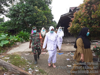 Anggota Koramil 05/Gas bersama Kepala Desa, Bhabinkamtibmas, RT, melaksanakan sosialisasi upaya pencegahan virus Corona ( covid 19), Senin,23/03/2020.