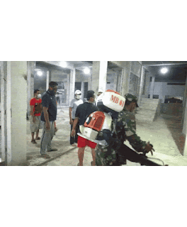 Kegiatan penyemprotan desinfektan dimulai Pukul 20.15 dengan menerjunkan beberapa anggota Koramil 11 Pulau Burung dengan menggunakan mesin penyemprot