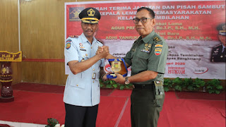 TEMBILAHAN,seribuparitnews.com - Kepala Staf Komando Distrik Militer (Kasdim) 0314/Inhil Mayor Inf Untung Kusmanto menghadiri acara serah terima jabatan sekaligus lepas sambut Kalapas Kelas llA Tembilahan. Dari pejabat lama Agus Pritiatno, BC. IP. SH. MH. Kepada Kalapas baru Adi Yanriko Mastur, BC. IP. SH, MH. Bertempat di Aula DR. Sahardjo Lapas Kelas llA Tembilahan, Senin (03/02/2020).