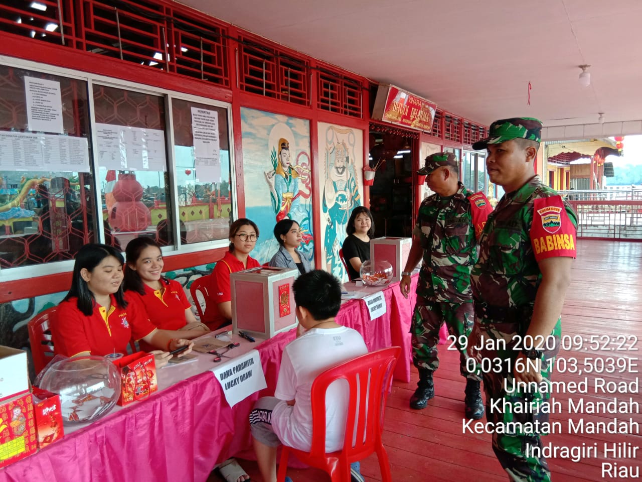 MANDAH,Seribuparitnews.com - Guna menciptakan rasa aman dan nyaman dalam merayakan Imlek dan  Cap Go Meh bagi warga (Paguyuban Sosial Marga Tionghoa (PSMTI) Kecamatan Mandah, Personil Koramil 08/ Mandah yaitu Serma Darmansyah dan Serda Erik Arianti melaksanakan Pengamanan dan memantau Kondisi di Sekitar Vihara Budhi Darma Sembuang Kelurahan Khairiah Mandah Rabu (29/01/2020).