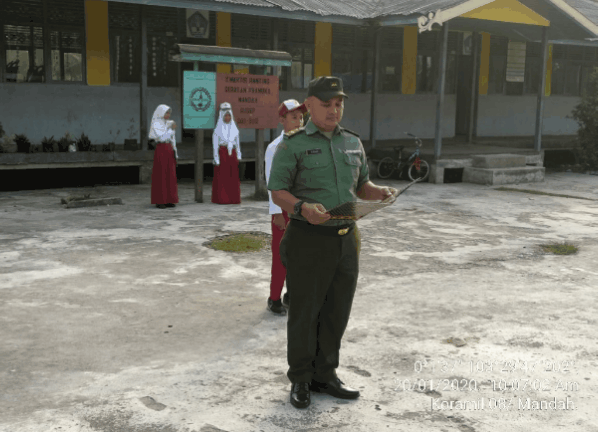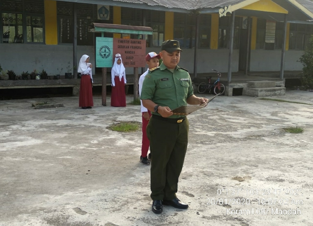 seribuparitnews.com MANDAH - Pjs. Danramil 08 Mandah Pelda Suriadi bertindak sebagai Inspektur Upacara di SD Negeri 043 Dusun Pandan Kelurahan Khairiah Mandah Senin (20/01/2020).